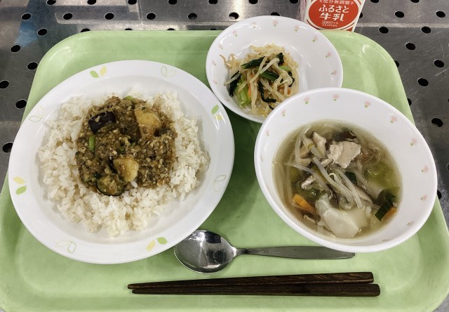 今日は、じゃがいもとなすのマーボー丼、有機にんじん入りナムル、ワンタンスープ、牛乳です。
