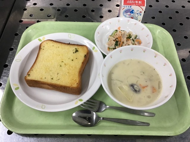 今日は、ガーリックトースト、大根とツナのサラダ、森のチャウダー、牛乳です。