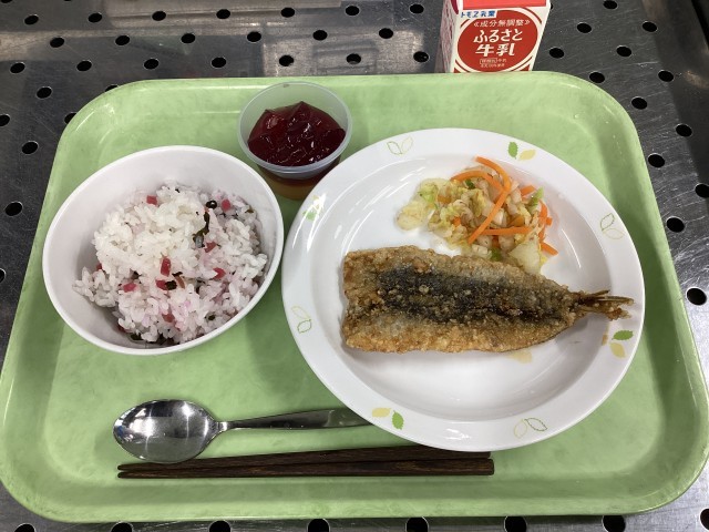 今日は、梅わかごはん、鰯のかば焼き風、白菜のおかかかけ、あじさいゼリー、牛乳です。
