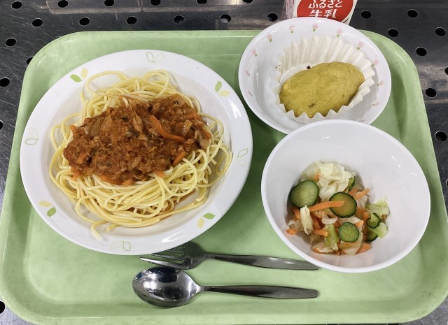 今日は、ツナトマトスパゲティー、キャベツサラダ、スイートポテト、牛乳です。