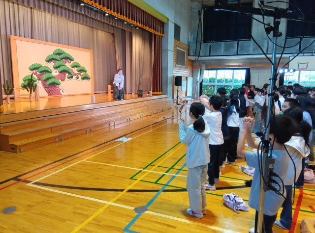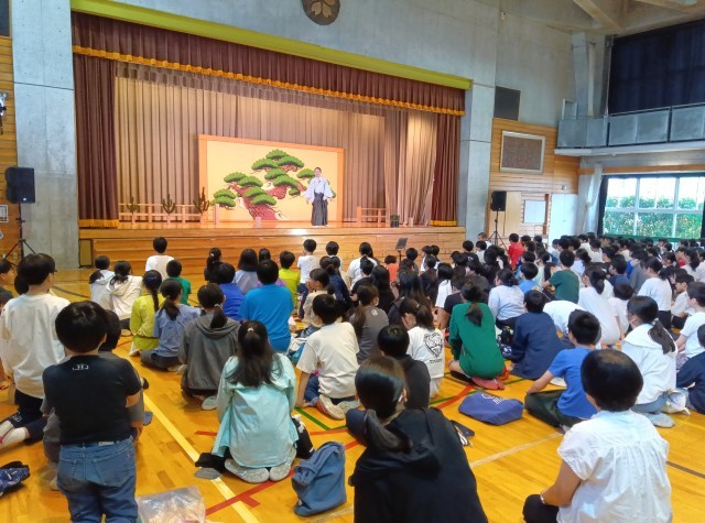 6年生は桜丘小学校を会場に行われた古典芸能鑑賞教室に参加しました。鑑賞したのは狂言「附子(ぶす)」です。狂言を実際に見たことがある児童は、笹原小と桜丘小の2校合わせても数名程度でした。体育館には、能舞台のセットが置かれ、照明や音響機器も本格的なものが用意されていました。演じたのは万作の会の皆様。初めて本物の狂言に触れた子どもたちは、とても熱心に鑑賞していました。