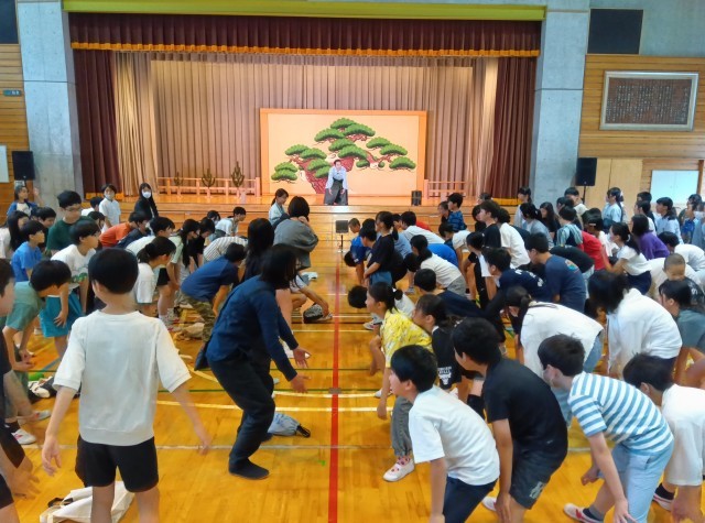 鑑賞の後はワークショップが行われました。「附子」の場面を実際に子どもたちが演じてみます。笹原小の子どもたちが「さてもさてもうまいことじゃ」と言うと、桜丘小の子どもたちが「食えば食うほどうまいことじゃ」と返すなど、狂言のセリフのやり取りを2校で楽しみました。古典芸能に親しむとともに、桜丘小の6年生との交流もできて、大変有意義な校外学習となりました。
