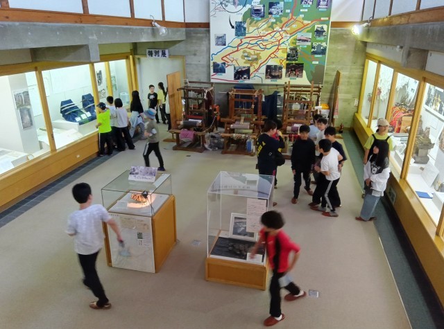 「川場村の昔の家で使っていた道具、古銭、月の輪熊の剥製、刀、鎧、機織り機、昔のボードゲーム、ごんぎつねの話にでてきた火縄銃、予科練の制服、昔の川場小学校で使っていた物品、弥生式土器、ナウマンゾウの化石」。以上子どもたちに取材した、印象に残った展示でした。