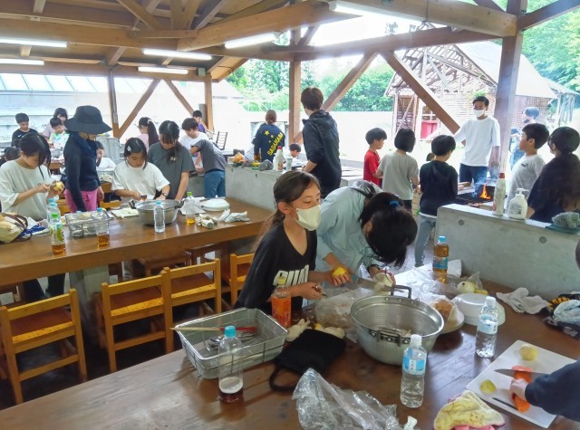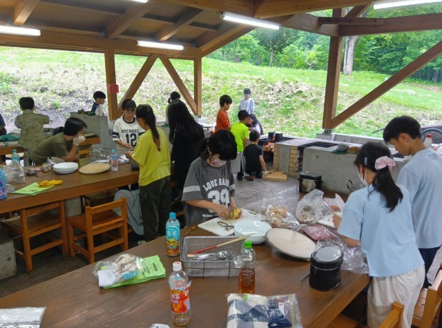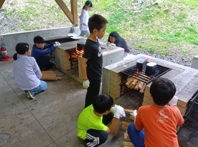 14時30分から少し早めの時間ですが飯盒炊さんが始まりました。家庭でのお手伝いや家庭科の調理実習の成果からか子どもたち手早く調理を行っています。調理と同時進行で片付けを行っている班もあり、中々の手際です。火も慎重に扱っていて、安全に進んでいます。