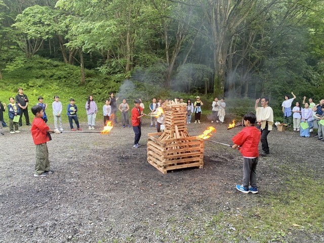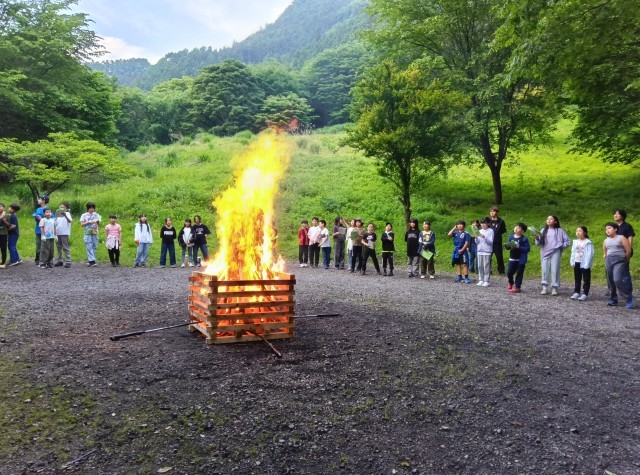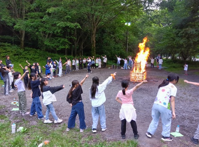 18時から今日最後の活動のキャンプファイヤーを楽しみました。火の子による櫓への点火の後、ダンスを踊ったり、ゲームをしたりして楽しみました。日が傾くと川場村は気温がぐっと下がってきて過ごしやすいです。この後、入浴し、おやつのバナナを食べて就寝します。