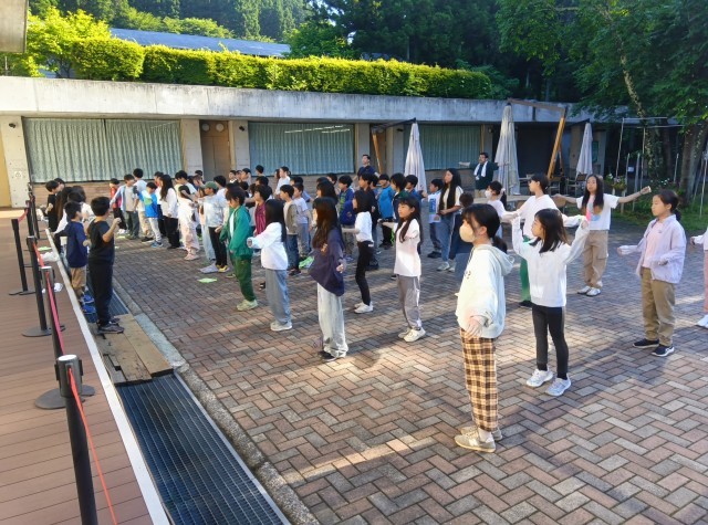朝6時に起床し、6時30分からビレジ前の広場で朝の集いを行いました。児童あいさつの後、ラジオ体操で身体を目覚めさせました。先生の話で、今日の予定や集団行動の約束事の確認などを行いました。気温は22℃で爽やかな1日のスタートです。
