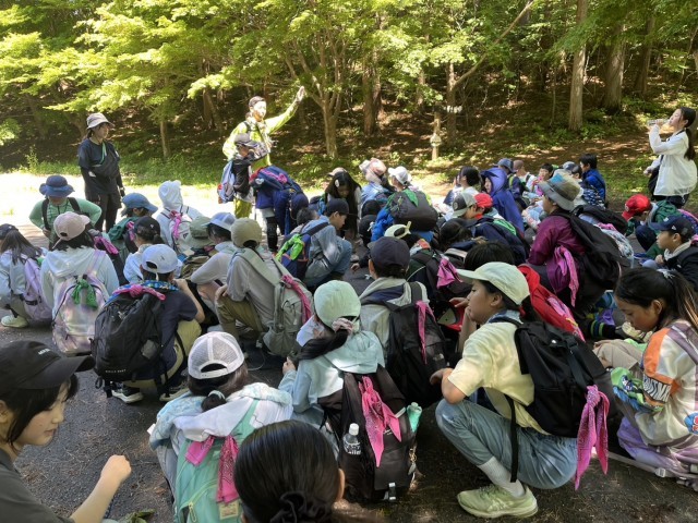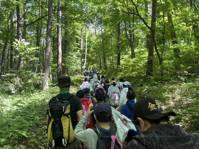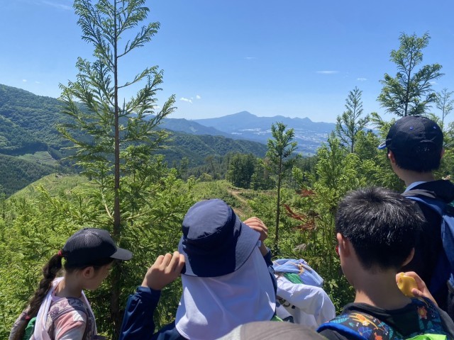8時45分にふじやまビレジから登山に出発しました。登山道に入ると木々の中を進んで行きますので気持ちよく歩くことができました。目的地の二十一世紀の森の頂上付近では、見晴らしがよく山の景色を楽しむことができました。登山道の気温は26℃程度でしたが、暑さに備えて復路はコースを短縮し、予定より30分早く11時30分に宿舎に戻ってきました。みんな元気です。