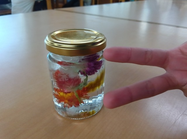 14時30分から川場里山プログラムとして「ハーバリウム作り」を行いました。ハーバリウムとはガラスの小瓶に花などをオイル漬けして長い間楽しむインテリアフラワーです。今日は「貝殻草」「千日紅」「ラグラス」「アナベル」などを素材に使いました。オイルを入れた後で、花の位置を調整して、世界で一つのオリジナルハーバリウムが完成ました。作品はお土産で持ち帰りますので、楽しみにしてください。