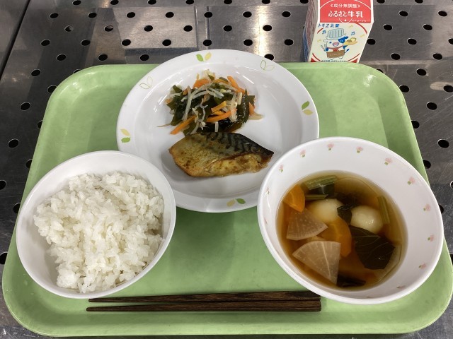 今日は、有機米ごはん、さばのカレー焼き、カリじゃこサラダ、じゃがいもだんご汁、牛乳です。