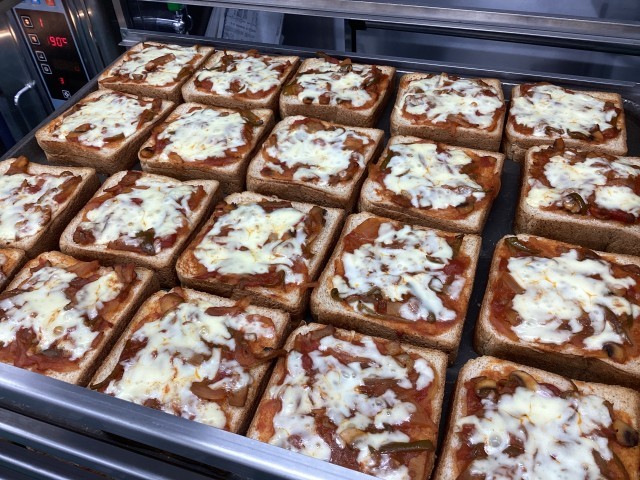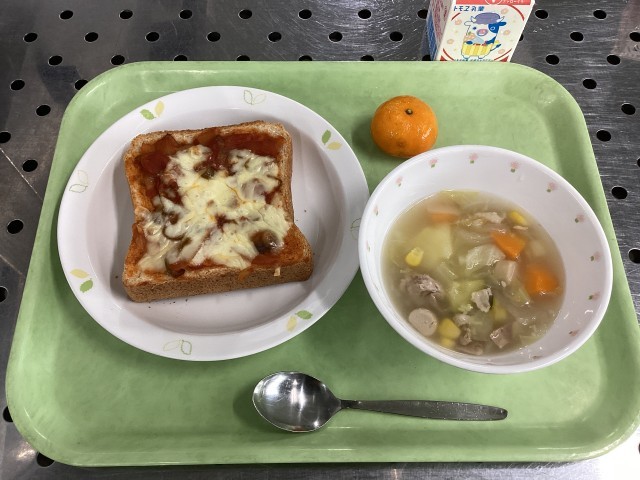 今日は、ピザトースト、夏野菜のポトフ、冷凍みかん、牛乳です。