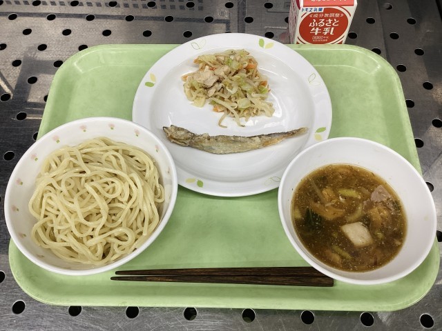 今日は、つけ麺、ししゃものから揚げ、棒々鶏サラダ、牛乳です。