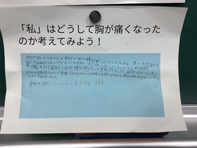 考えの共有を通して他者の気持ちを理解することの大切さや無視をされることによるつらさなど様々な考えを発表することができました。