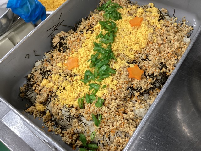 今日は、七夕そぼろ丼、天の川すまし汁、小玉すいか、牛乳です。