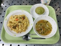 今日は、ツナ入りカレーピラフ、きゃべつのスープ、エメラルドの国のケーキ、牛乳です...