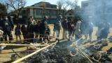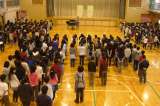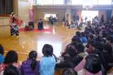 火がおさまるまでの間、体育館で両面踊りや獅子舞を見ました。お囃子が流れる中、子...