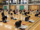 体育館で書初めをしています。 誰一人としてしゃべる子どもはいません。 集中し...