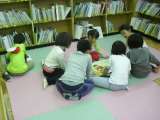 昼休みの図書館のようすです。 雨で校庭が使えません。 1年生が読み聞かせごっ...