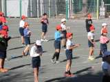 体育の授業の様子です。 準備体操をしてウォーミングアップをしています。 天気...