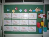 保健室の掲示板です。手の洗い方の説明が、絵と文でわかりやすく書いています。みの...