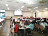読売新聞府中工場見学スタート 全員そろって写真を撮った後、新聞作りの勉強をします...