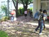 正門脇の八重桜が散り始めました。 花が落ちてじゅうたんのように広がっています。...