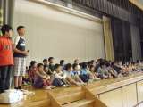 児童朝会で運動会の応援合戦の練習を行いました。 連日の朝練習の成果を発揮して、...