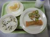 ◆本日の献立 *わかめとじゃこのごはん *牛乳 *春巻き *ハム入り中華...