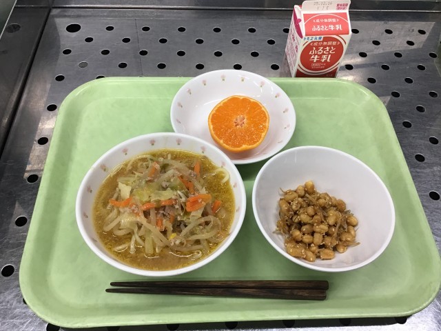今日は、みそラーメン、大豆とじゃこの甘辛あげ、菊花みかん、牛乳です。