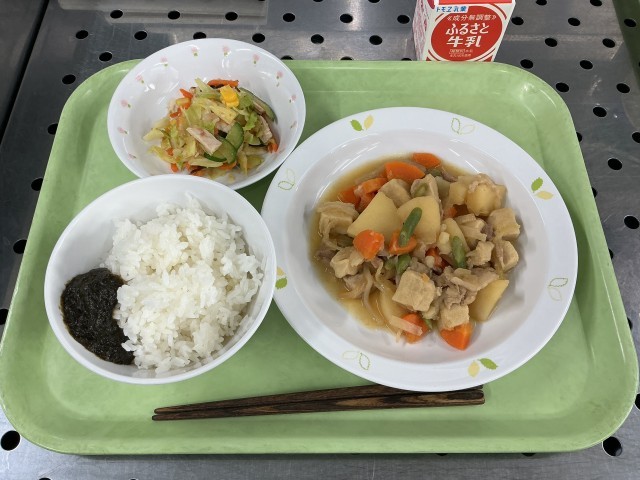 今日は、有機米ごはん、のりの佃煮、肉じゃがうま煮、りっちゃんの元気サラダ、牛乳で...