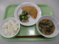 【今日の献立】・ごはん・ジャンボぎょうざ・白菜の中華スープ・きゅうりと大根の中華...