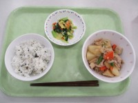 【今日の献立】・わかめとじゃこのごはん・春野菜の肉じゃが・みそドレッシングサラダ...