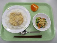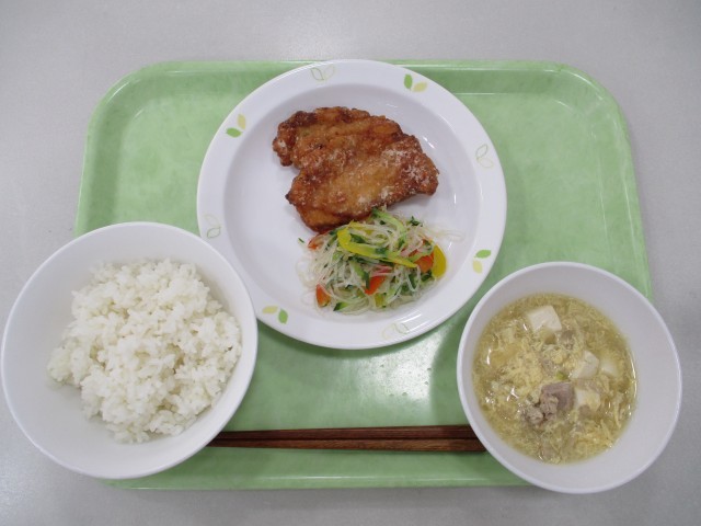 【今日の献立】・ごはん・鶏肉のから揚げ・かきたま汁・春雨サラダ・牛乳