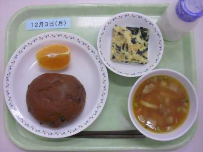 今日の給食は、チョコチップパン・牛乳・ツナのキッシュ・ミネストローネ・フルーツ(紅マドンナ)です。