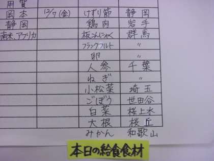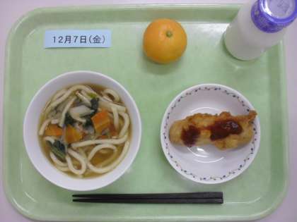 今日の給食は、けんちんうどん・牛乳・アメリカンドッグ・フルーツ(みかん)です。
