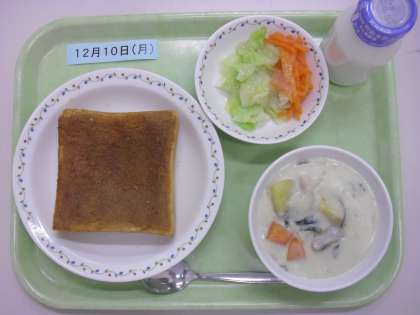 今日の給食は、きな粉バタートースト・牛乳・季節野菜のクリームシチュー・きゃべつサラダです。