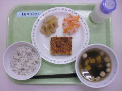 今日の給食は、ゆかりごはん・牛乳・松風焼き・紅白なます・豆きんとん・すまし汁です。