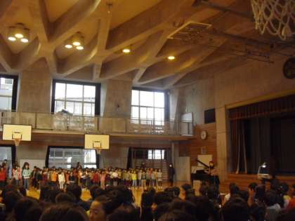 盛り上がる部分の「明日になって 空が晴れたら」という歌詞は、3・4年生が後から追いかける、『掛け合い』という歌い方をしました。
