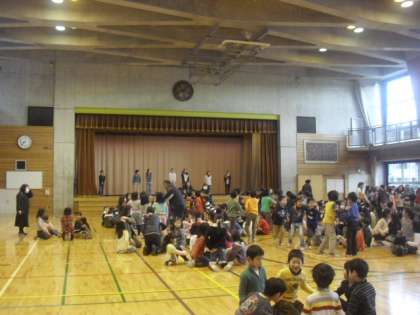 今回は低学年と高学年に分かれて、低学年は体育館で「猛獣狩りに行こうよ」を、高学年は校庭で「伝言ゲーム」をしました。
