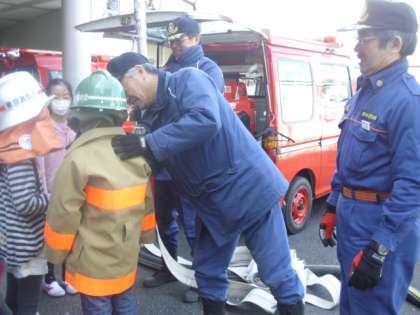 消防団のヘルメットや制服を身につけた子どもからは、「こんな重いものを着て仕事をしているんだ」と驚きの声があがっていました。普段聞くことのできない貴重なお話をたくさん聞くことができ、とても充実した時間を過ごすことができました。