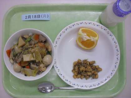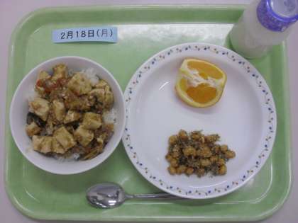 今日の給食は、中華丼 or 麻婆豆腐丼・牛乳・大豆とじゃこの甘辛揚げ・フルーツ(いよかん)です。
