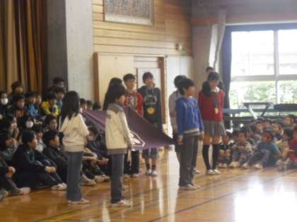 6年生がプレゼントされたメダルを胸に1年生と入場すると、まずは6年生から5年生へ、校旗の引き継ぎが行われました。