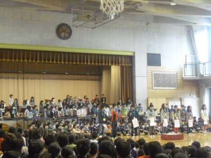 次に各学年から、6年生への感謝の言葉が贈られました。1年生からは「入学したころは、毎日お世話に来てくれてありがとうございました。」5年生からは「花の子班ではおもしろい遊びを考えてくれました。」「クラブや委員会でも優しく教えてくれました。」などの感謝の言葉とともに、歌や詩などが贈られました。