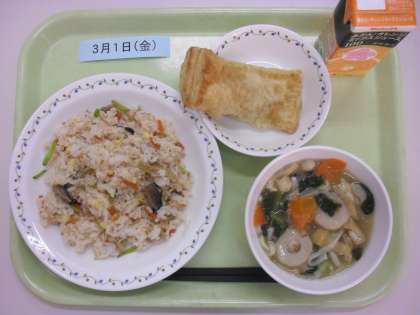 今日の給食は、ちらしずし・オレンジジュース・あんかけ汁・お楽しみデザートです。