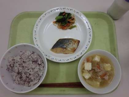 今日の給食は、ゆかりごはん、牛乳、魚の西京焼き、野菜のからししょうゆかけ、豆腐汁です。