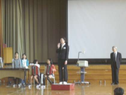 はじめに、教育実習生の紹介がありました。4年生と1年生にそれぞれ一人ずつ入り、4週間実習を行います。2人とも桜丘小学校の卒業生です。