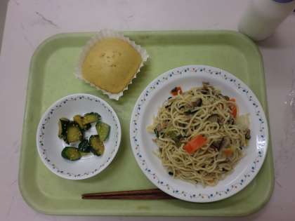 今日の給食は、塩焼きぞば、牛乳、きゅうりの中華味、黒砂糖入り蒸しパンです。