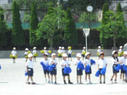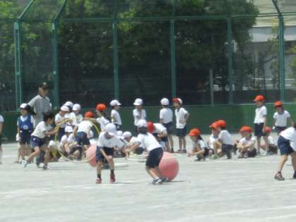 18日の運動会にむけ、練習に力が入っています。写真は、5年の「シュート!騎馬ボール」1年の「チェッコリ玉入れ」3年の「ファイヤーボール」の練習風景です。