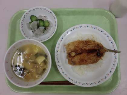 今日の給食は、いわしのかば焼き丼、牛乳、みそ汁、大根のゆかりあえです。