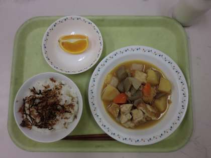 今日の給食は、ごはん、牛乳、かみかみ佃煮、五目うま煮、バレンシアオレンジです。