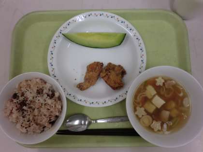 今日の給食は、赤飯、牛乳、鶏肉のからあげ、七夕汁、メロンです。